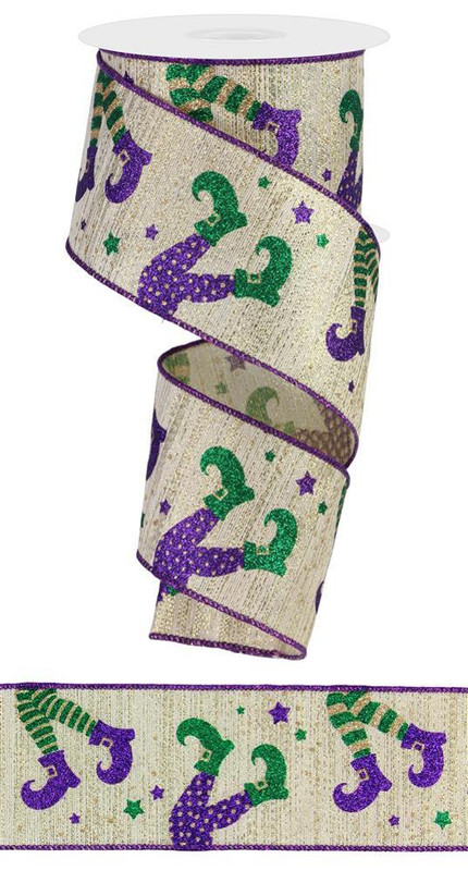 Add a fun touch to your Mardi Gras wreaths and bows with this Metallic Elf Legs Ribbon! This metallic gold ribbon features green, gold, and purple elf legs with purple borders. Measures 2.5in x 10yds.