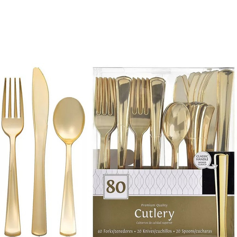 Description Make sure your party guests get to eat in elegant style with this Metallic Gold Premium Plastic Cutlery Set! Package includes 40 forks, 20 knives, and 20 spoons. Additional Details SKU: PT_0192937313664