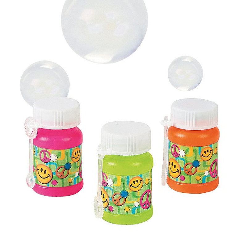 Create a groovy party scene with these Mini 60s Bubble Bottle Favors! These mini neon plastic bottles feature peace signs, smileys, and flowers with an attached bubble wand. Package includes 4 – 1oz bottles.