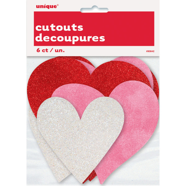 Add some sparkle to your Valentines Day décor with these Mini Hearts Glitter Cut Outs! These paper cutouts feature glittery white, pink, and red hearts. Package includes 6 assorted size cutouts.