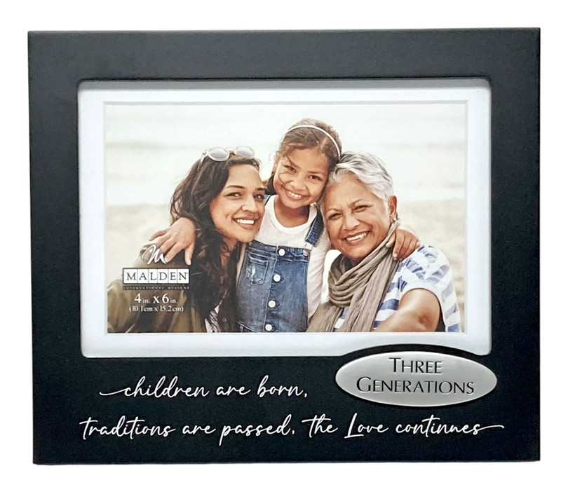 Celebrate family with this Three Generations Frame! This black fiberboard horizontal frame features "children are born, traditions are passed, the Love continues" in white script along the bottom beside a silver tone three dimensional overlay with "THREE GENERATIONS" in black text. Measures 7.75in x 6.5in and holds a 4in x 6in photo.