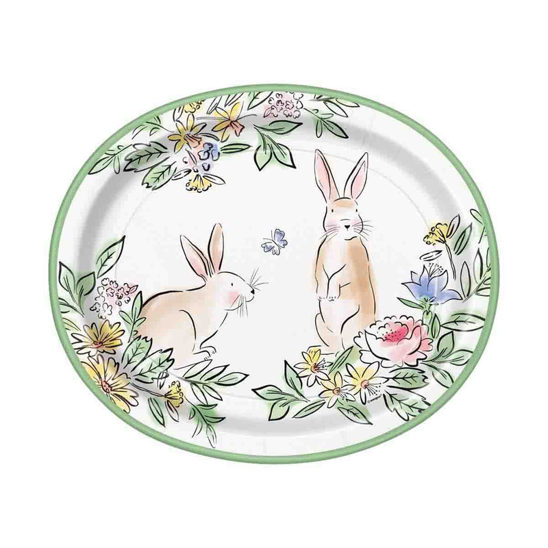 Add a charming touch to your Easter celebration with these Dainty Easter Oval Plates. Perfect for dinner or a large meal, these green trimmed paper plates feature a soft watercolor design showcasing two adorable brown and white bunnies surrounded by flowers and a tiny blue butterfly. These plates measure 12 inches and include 8 count in each pack.
