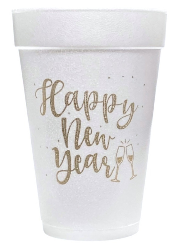 Ring in the New Year with these 16 oz white Styrofoam Cups, featuring the words "Happy New Year" in gold script beside clinking champagne glasses. Each sleeve includes 25 durable cups, perfect for hot or cold drinks at your holiday gathering. Add a festive touch with these must-have cups.