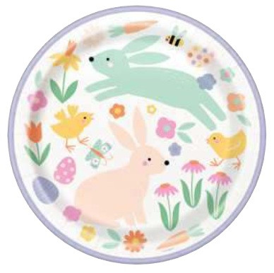 Brighten up your table setting with these Playful Easter Luncheon Plates. These white, round paper plates feature a light purple trim and simplified colorful flowers, chicks, a butterfly, a bee, a seafoam green rabbit, and an off white rabbit. Package includes 8 count plates measuring 8.75in