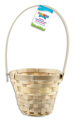 Use this Natural Round Bamboo Basket as a fun Easter table decoration! This small basket features a natural bamboo design with an attached handle. Measures 6.25in x 5in x 9.5in.