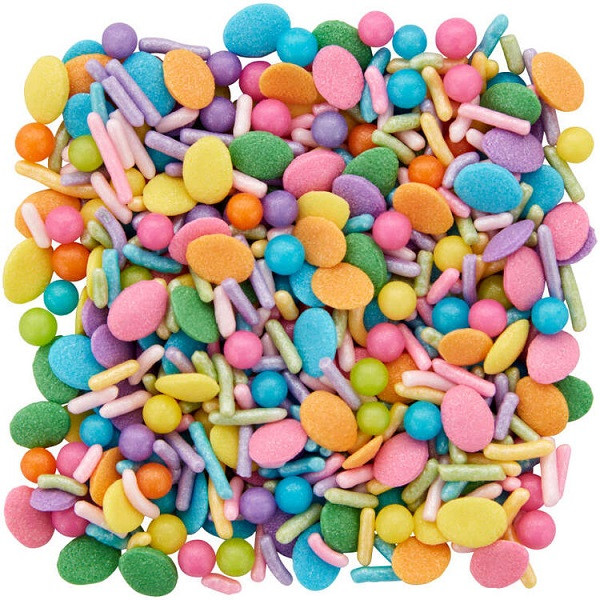 Create colorful treats with this Bright Pastel Easter Egg & Jimmies Sprinkle Mix! This edible mix features green, blue, orange, pink, yellow and purple confetti egg sprinkles, green, blue, orange, pink, yellow and purple pastel jimmies, green, blue, orange, pink, yellow, and purple jumbo nonpareils and nonpareils. Net WT 3.98oz.