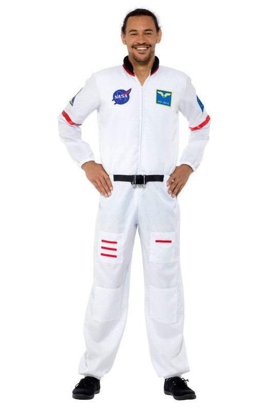 Take one giant leap for mankind as you dress up in this Astronaut costume! This polyester costume features a white jumpsuit with accents of red and decorative patches, along with a black belt. Shoes not included. Available in adult sizes Small, Medium, Large, and X Large.