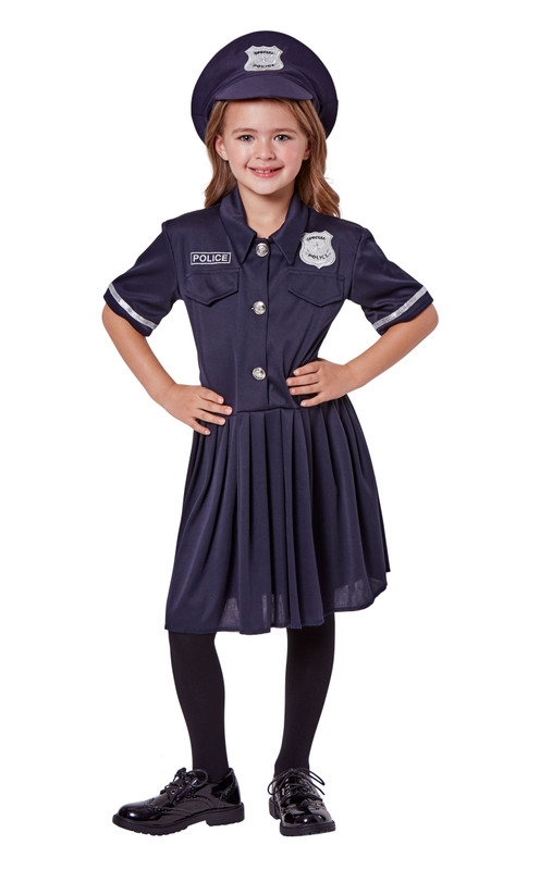 Let your child dress up as a member of the police force for Halloween with this Police Girl costume! This costume features a navy blue dress and hat with silver buttons and badge patches. Tights and shoes not included. Available in sizes Small (3 - 4), Medium (5 - 6), Large (7 - 8), and X Large (9 - 10).
