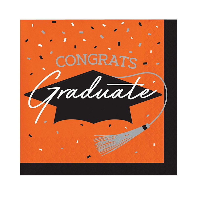 Elevate your graduation party with these Orange Grad Beverage Napkins. Featuring an orange background with a black edge, these 2-ply paper napkins are decorated with black, grey, and white confetti. "CONGRATS" is in grey letters while "Graduate" is in white script over a black graduation cap silhouette with grey tassel. Package includes 36 count napkins that measure 5in x 5in when folded.