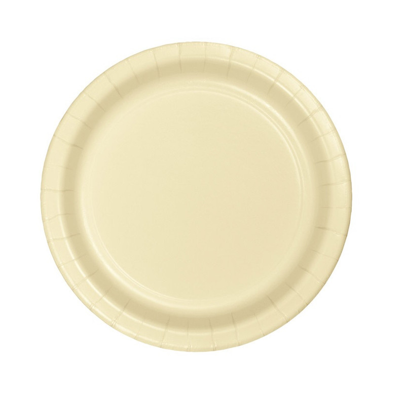 Add some stylish flair to your party treats when you serve them on these Ivory Paper Dessert Plates! These sturdy paper plates feature a classic ivory color with raised edges. Package includes 24 count 7in plates.
