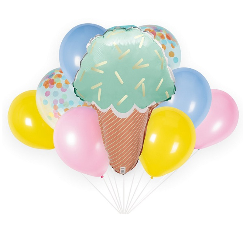 Create the sweetest look for your party with this Pastel Ice Cream Balloon Bouquet Kit! Package includes 6 count 12in latex balloons, 2 count 12in confetti balloons, and 1 count 22in foil balloon. Ribbon not included. *Online orders are for uninflated balloons only*