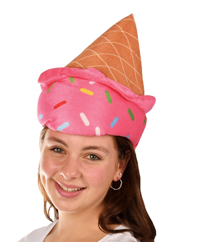 This Plush Ice Cream Cone Hat makes for a sweet accessory! This plush fabric hat features an upside down classic brown ice cream cone with a scoop of pink ice cream and colorful sprinkles. One size fits most.