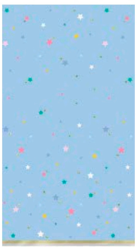 Add some soft colors to your table setting with these Pastel Plastic Tablecover. This rectangular plastic tablecover features a pattern of multicolor tiny stars on a pastel blue background, accented with shimmery gold. Measures 54in x 84in.