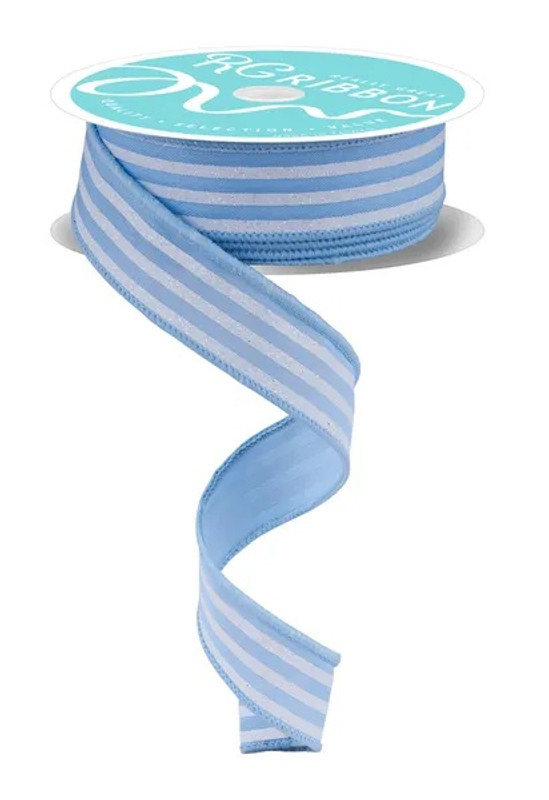 Give your baby shower or Easter bows and wreaths some shining flair with this Light Blue with Glitter White Vertical Stripes Ribbon! This light blue polyester ribbon features glittery white vertical stripes. Measures 7/8in x 10yds.