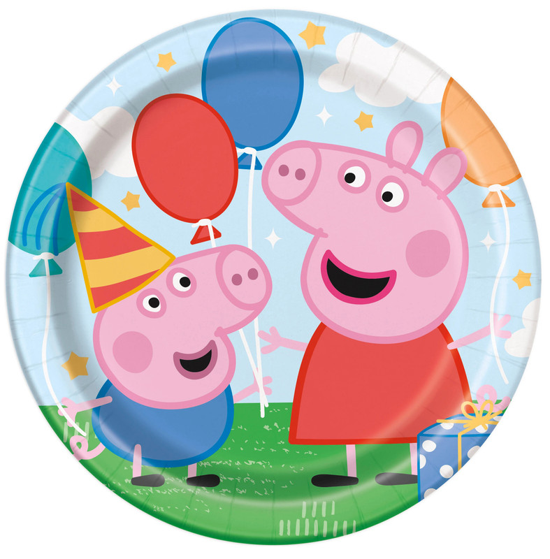 Make mealtime extra fun with these Peppa Pig Luncheon Plates! Featuring a design with Peppa and her little brother George amongst colorful balloons against a blue sky and green grass background, these plates are perfect for any Peppa Pig-themed party. Package includes 8 count 9in paper plates.