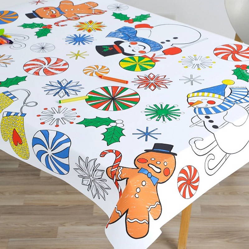 Let your little ones add some festive color to your Christmas party table with this Peppermint Twist Color in Paper Tablecover! This white paper cover features assorted holiday images to color. Measures 48in x 36in.