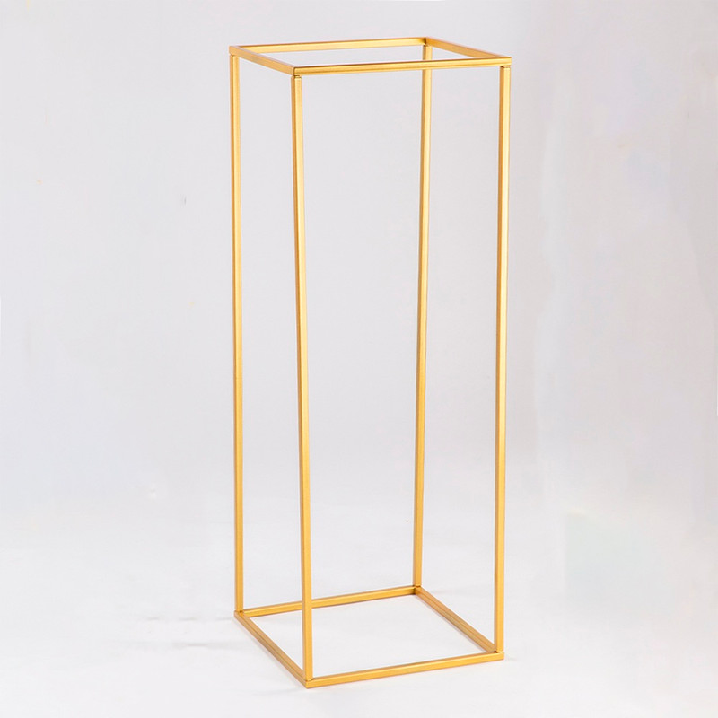 This Gold Metal Rectangular Stand features a sleek frame design, perfect for adding a modern and sophisticated touch to any space. Made from metal with a gold finish, this stand is both sturdy and stylish. Measures 30in height x 11in width.