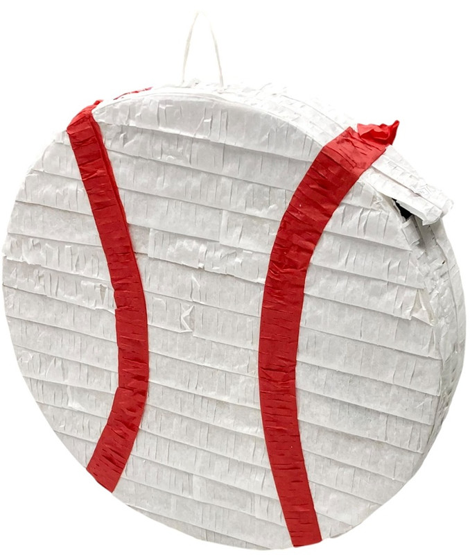 Hit a home run with this Flat Baseball Pinata! Shaped like a classic white baseball with red details, this pinata has flat sides. It has a twist paper hanger on top and a seal on the upper side. Measures 17.5in in diameter x 3.75in thick.