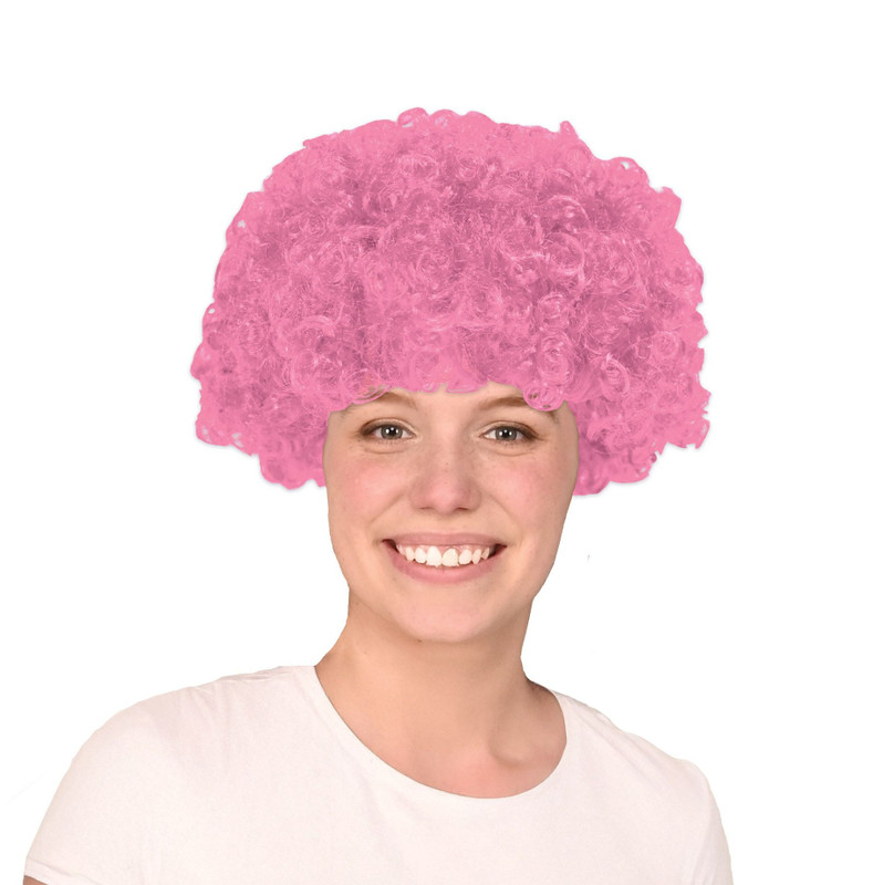 Give your spirit gear some pizzazz with this Pink Curly Wig! This fun, synthetic fiber wig features a light pink color. One size fits most teens and adults.