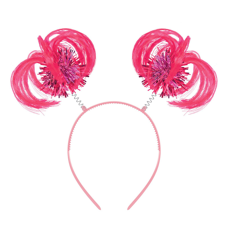 Add a pop of color to your team spirit look with this Ponytail Headbopper! This pink plastic headband features 2 pink tufts of synthetic hair, along with pom poms of metallic pink tinsel, attached to springs. One size fits most.