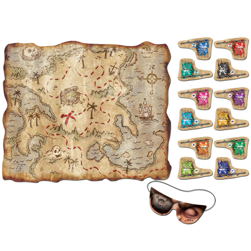 Send your young pirates on a party treasure hunt with this Pirate Treasure Map Party Game! Package includes 1 – 17.5in x 19.5in game poster, 12 flag stickers, and 1 paper blindfold.