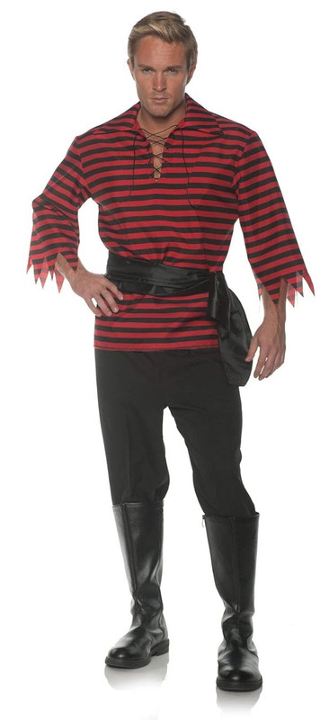 Become a master of the high seas with this Black and Red Pirate Set! This costume features a black and red horizontal striped lace front shirt with ragged sleeves, black pants, and a black fabric sash. Boots not included. Available in one size that fits most adults and 2X Large.