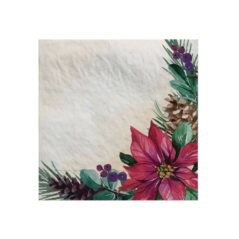 Add a touch of elegance to your holiday table with these Traditional Poinsettia Beverage Napkins! These 2-ply paper napkins feature a watercolor ivory color with edge decorated by a red poinsettia, pinecones, berries, and other festive greenery. Package includes 16 count napkins measuring 5in x 5in when folded.