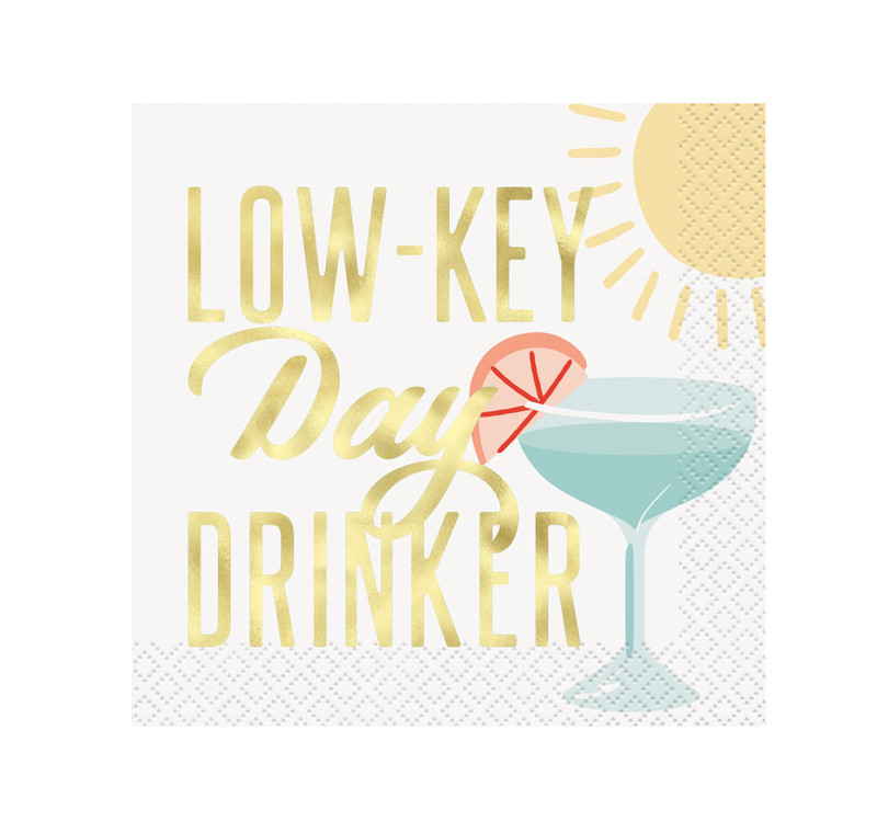 Add a splash of sass to your summer sipping with these Poolside Summer Day Drinker Beverage Napkins. Featuring a white background with a faded yellow sun in the upper right corner, these 2-ply paper napkins show a light blue drink with a slice of pink fruit, and the playful gold foil text "LOW-KEY Day DRINKER." Package includes 16 count napkins measuring 5in when folded.
