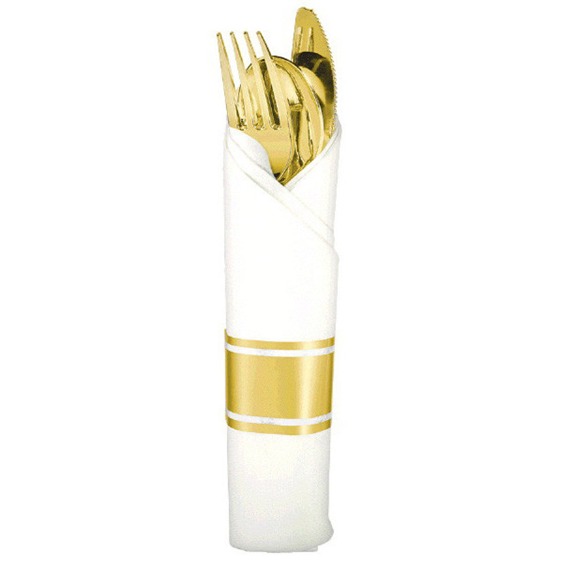 Add a touch of hassle-free elegance to your party table with this Premium Plastic Goldtone Rolled Cutlery! This shiny, plastic gold cutlery is pre-rolled for you in a white napkin with a golden stripe. Package includes 10 rolled cutlery sets.