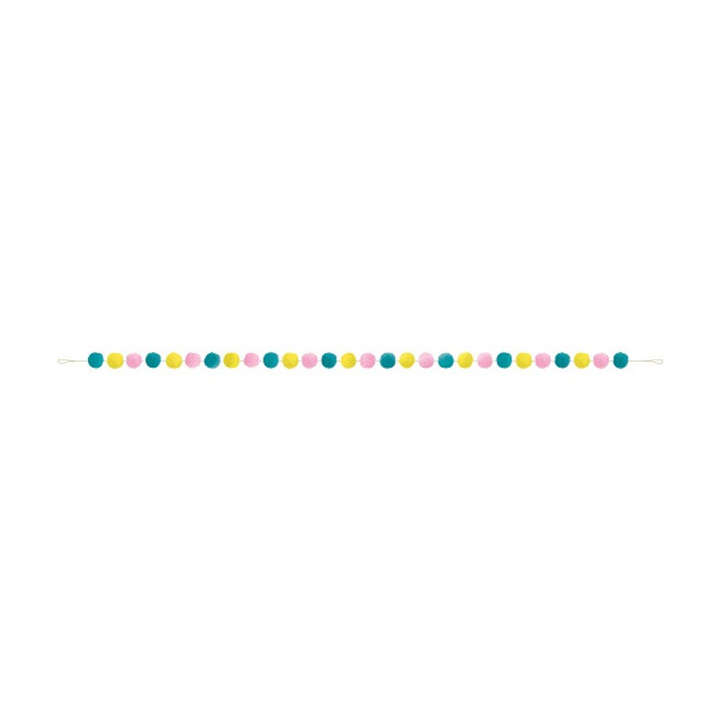 Add some eye-catching color to your party décor with this Rainbow Birthday Sweets Pom Pom Garland! This decorative garland features pink, yellow, and teal pom poms with white and metallic gold twine. Measures 9ft.
