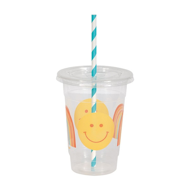 Put some smiles on your party drinks with these Rainbow Roller Skate Plastic Cups! These clear plastic cups feature printed rainbows and smiley faces on them. Package includes 4 16oz cups and 4 8in paper straws.