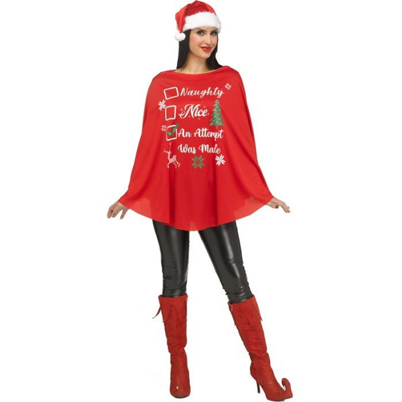 Dress up in fun holiday style in this Red Naughty Christmas Poncho! This red fabric poncho features a checklist with Naughty Nice An Attempt Was Made in white letters. Includes poncho only. One size fits most sizes 4 14.