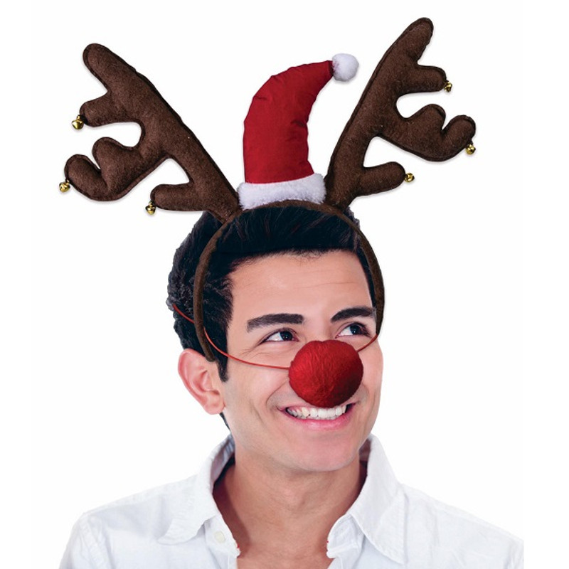 Dress up as Rudolph for Christmas with this fun Reindeer Nose & Antler Headband Set! This set features a brown antler headband with attached jingle bells and a strap on plush nose. One size fits most.