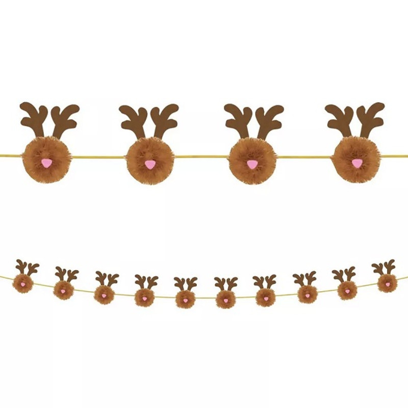Add a cute look to your Christmas décor with this Reindeer Pom Pom Garland! This garland features brown pom poms with pink, green, and teal felt noses and brown antlers attached to a red hanging ribbon. Measures 5.5ft.