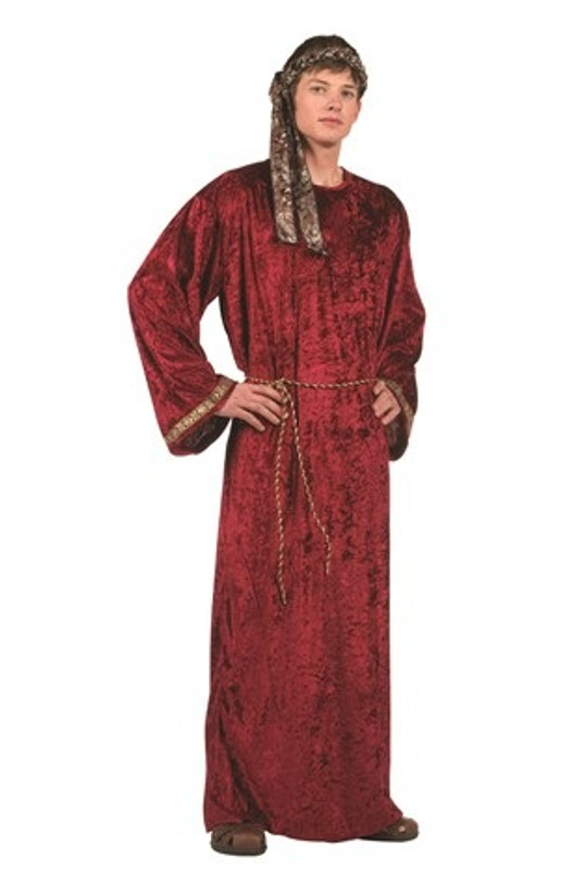 Become a part of the biblical welcoming committee when you wear this Burgundy Wise Man costume! Grab this complete to complete your wisemen group costume or be a wiseman of your own! This costume includes a burgundy wine red color velvet robe with gold patterned accents, a rope belt, and a matching headpiece. Shoes not included. One size fits most adults.