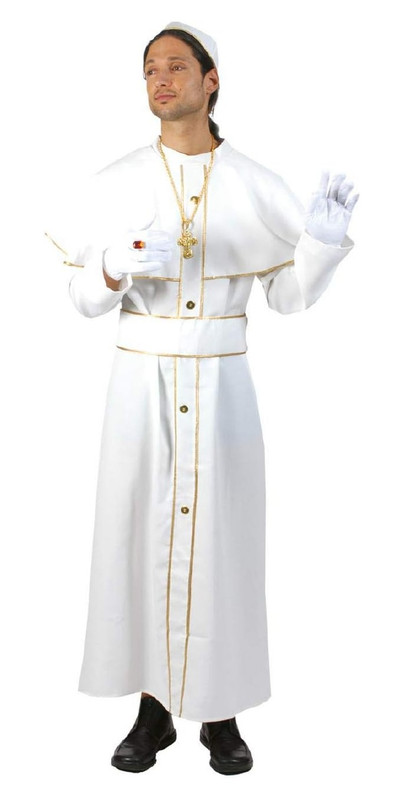 Become a holy man for Halloween with this Holy Pope costume! This costume features a white robe with cape along with a matching belt and hat, all with gold accents. Shoes, ring, necklace, and gloves not included. Available in adult sizes Small 48 - 50, Medium 52 - 54, and Large 56 - 58.