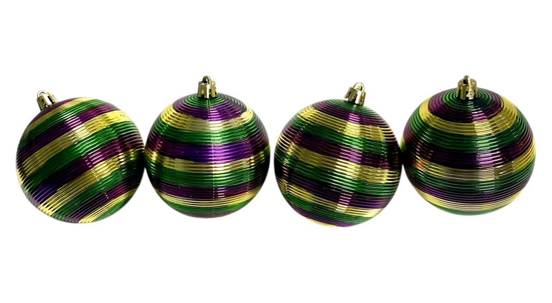 Bring a fun, festive vibe to your Fat Tuesday celebration with these Mardi Gras Striped Round Ornaments. This set includes 4 ornaments with shimmery metallic horizontal stripes in purple, green, and gold. Package includes 4 count ornaments measuring 2.75in.