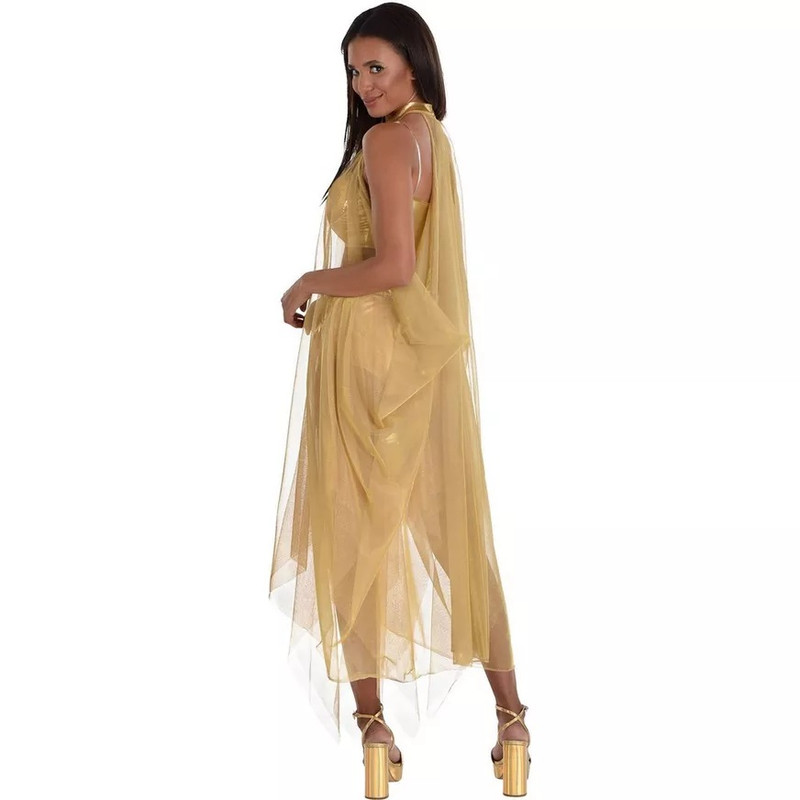 Transform into a dazzling glam goddess with this sparkling accessory! The oversized capelet is made from sheer, glittering gold organza, gracefully draping over your shoulders and down your back. It features an adjustable front closure and a choker-style collar adorned with intricate filigree and a striking large silver gem. Crafted from 100% polyester (exclusive of decoration), this capelet is a one-size-fits-most design suitable for teens and adults. Please note that the headband, top, skirt, and shoes are not included.