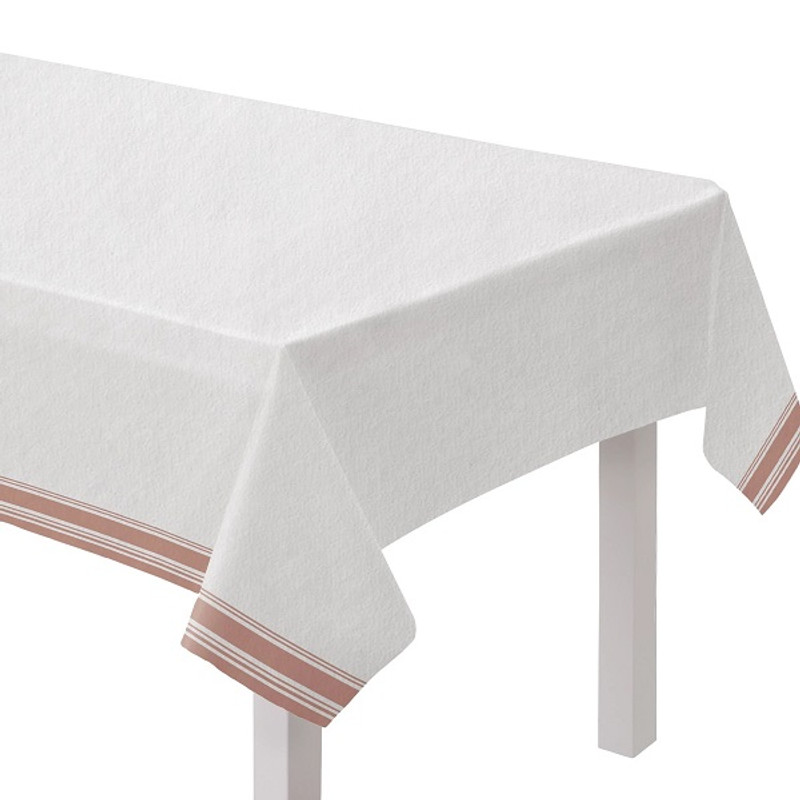 Add some extra style to your table with this Rose Gold Airlaid Table Cover! This white, woven paper cover features the feel of soft linen with rose gold striped borders. Measures 54in x 102in.