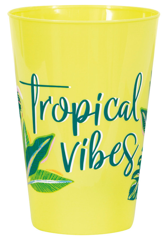 Add a pop of color to your summer spread with these Tropical Vibes Plastic Cups. These bright, reusable yellow plastic cups features "Tropical Vibes" in green script, with bright green leaves with pink accents. Package includes 6 count cups measuring 16oz, 5in tall.