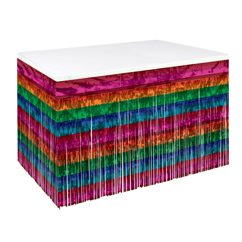 Decorate your Cinco de Mayo party table with this Fiesta Metallic Fringe Table Skirting! This 1 ply foil skirting features a shiny metallic finish with stripes of pink, orange, blue, and green, with a white reinforced edge for taping. Measures 30in x 14ft.