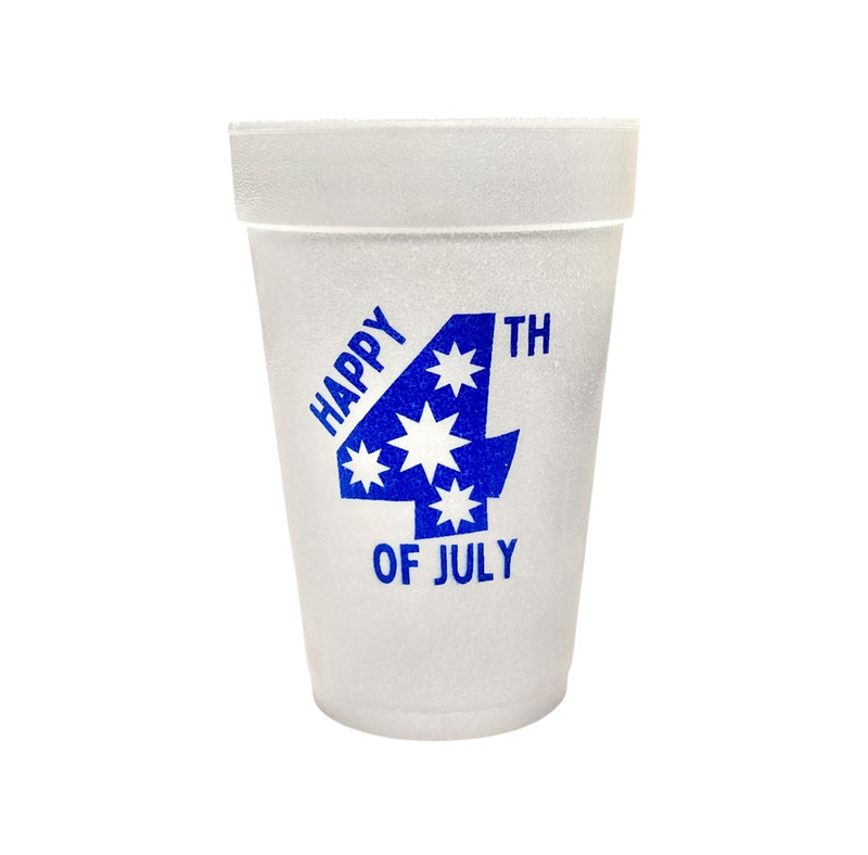 Celebrate with these Fourth of July Styrofoam Cups! These white Styrofoam cups feature prints on both sides that say "Happy 4th of July" with the "4" being larger than the rest of the text. Prints available in red or blue. Package includes 25 count, 16 ounce cups. Desired color not guaranteed.