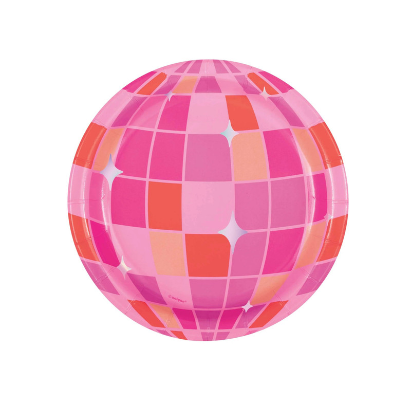 Serve up sweet treats with style using these Summer Disco Dessert Plates. Designed to look like pink disco balls, each plate shimmers with iridescent foil sparkles. Perfect for pool parties, bachelorette parties, or disco-themed celebrations. Package includes 8 count plates measuring 6.75in.