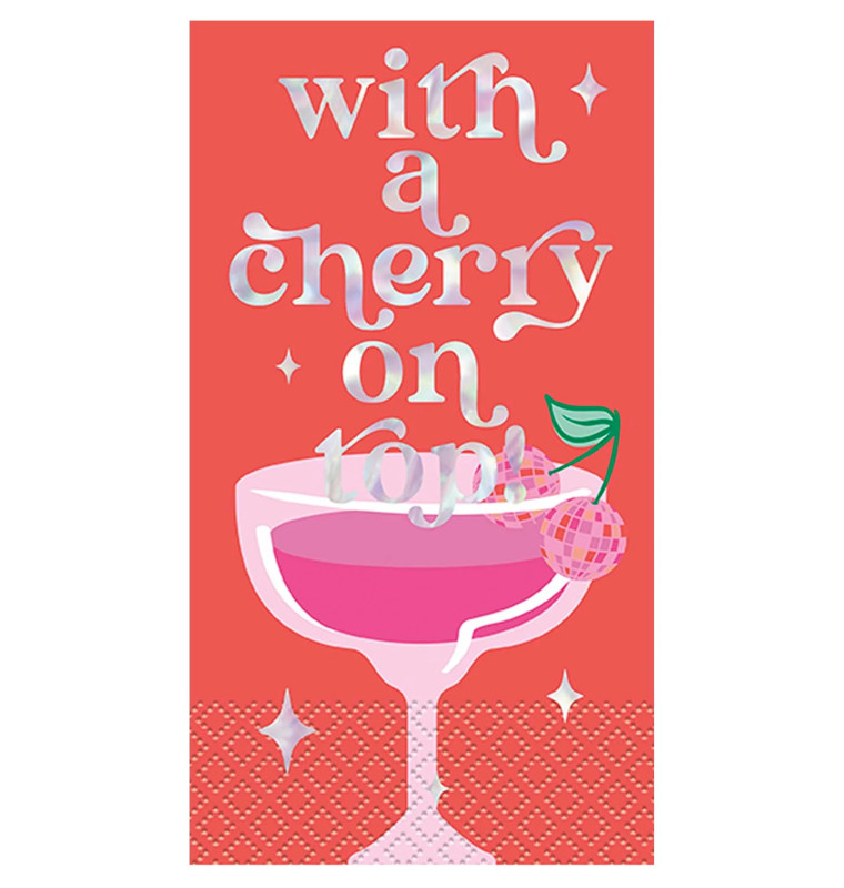 Add some glam to your gathering with these Summer Disco Guest Towel Napkins. Featuring a salmon pink background, a bright pink cocktail, and disco ball shaped cherries, these 3 ply paper napkins include iridescent foil accents and the phrase "with a cherry on top!" Great for a disco-themed bash, a summer soirée, or a bachelorette weekend. Package includes 16 count napkins measuring 4.25in x 7.75in when folded.