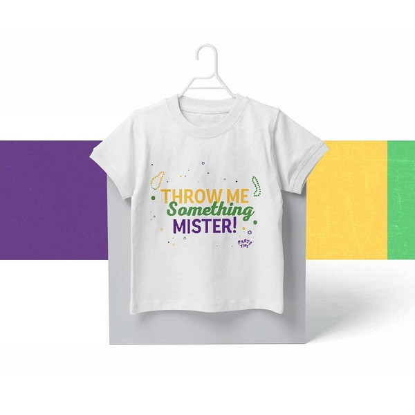 Let your little one make all of the noise for Mardi Gras with this Throw Me Something Mister Child T-Shirt! This white cotton shirt features “Throw Me Something Mister!” in green, yellow, and purple letters.