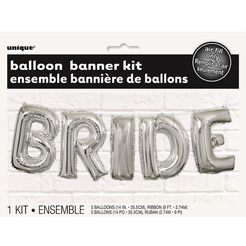 Add some sparkle to your bridal shower decor with this Silver Foil Bride Balloon Banner Kit! Includes 5 – 14in letter balloons, 1 – 9ft ribbon, and 1 inflating straw. Inflate with air only, do not use with helium