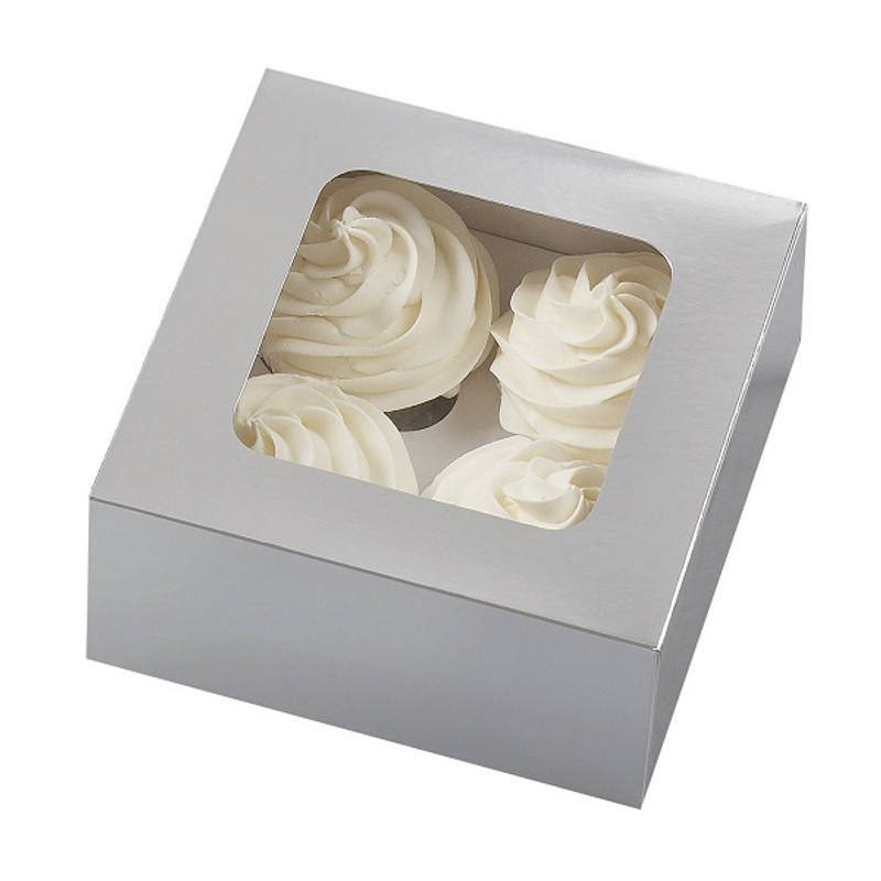 Description Create the perfect gift with these Silver Medium Treat Boxes! Great for candies or 3.5 in. cookies. Includes insert for 4 cupcakes. Measures 6.25in x 6.25in x 3in. Additional Details SKU: PT_0070896013590