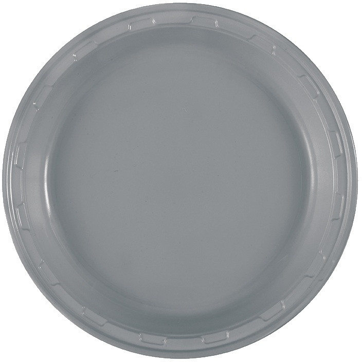 Serve your favorite party foods on these Silver Gray Dinner Plates! These sturdy round plastic plates feature a gray color with a slight sheen. Package includes 50 count 10in plates.