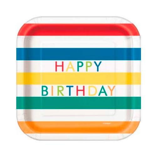 Keep it simple for your birthday celebration with these Colorful Birthday Dessert Plates. These white square shaped paper plates feature "HAPPY BIRTHDAY" in multicolor letters in between multicolor stripes. Package includes 8 count plates measuring 7in.