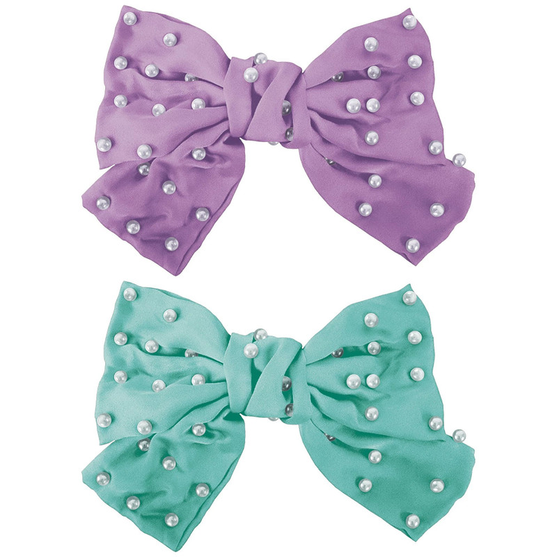 Complete your birthday party look with these Hair Bows with Pearls. These shimmery purple and light blue satin bows are covered in plastic white pearls and are attached to large hairclips. Package includes 2 count bows measuring about 6.25in x 5in.